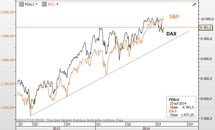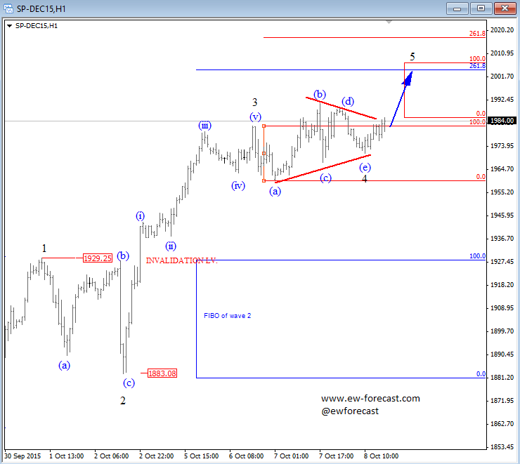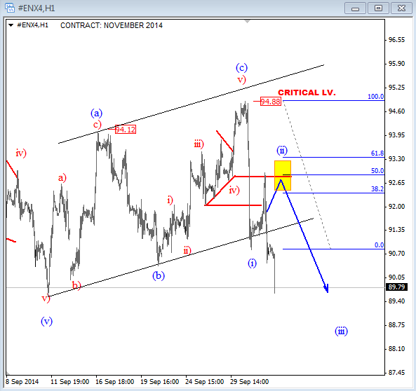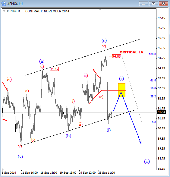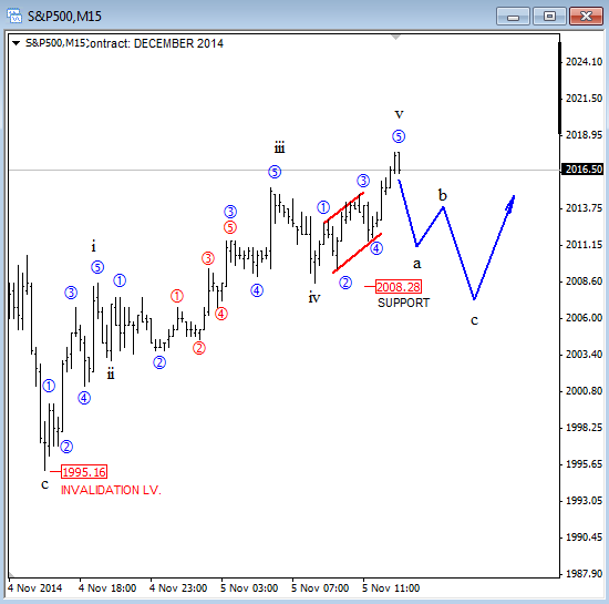 Previous Next Oct 09 2014; USD Index "Do or Die" Support USD Index has turned down in this week, and now testing an important equality level on intraday charts that comes in at daily trendline connected from mid August. Keep in mind that bigger trend is still up! Catch market swings. Try our services now! EXCLUSIVE OFFER AVAILABLE: 2 Months For Price Of 1 ![]() Previous Next Oct 10 2014; DAX Testing Neckline I do not like call a top or bottom in any market so we need to be patient and wait on a weekly maybe even monthly close beneath the neckline before downtrend continuation can be confirmed. For now, price still only testing a trendline. Catch market swings. Try our services now! EXCLUSIVE OFFER AVAILABLE: 2 Months For Price Of 1 ![]() Previous Next Nov 05 2014; E-mini S&P Futures Nice clear pattern on 15min time frame. we see five waves up, so be away of a set-back before looking for more gains. This trend stay up as long as 1995 remains in place. I would not be buying it here. Catch market swings. Try our services now! EXCLUSIVE OFFER AVAILABLE: 2 Months For Price Of 1