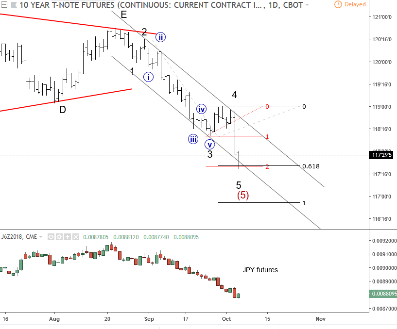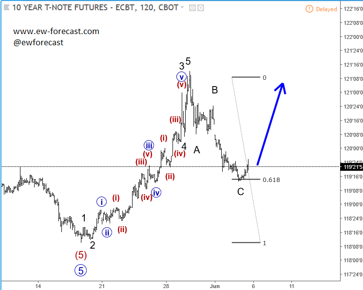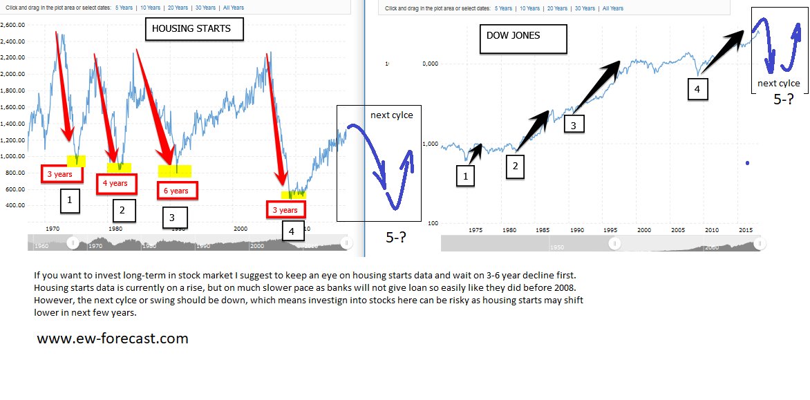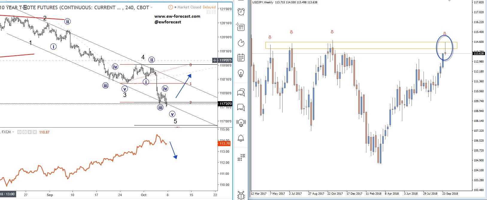 Previous Next Feb 08 2018; GBPJPY: Wedge Suggests More Weakness GBPJPY is at interesting junctures ahead of BoE today; Ending diagonal on 4h and five wave decline on 1h chart suggests more downside ahead. GBPJPY 4H and 1H ![]() Previous Next Feb 13 2018; Intraday Bullish Path on E-mini S&P500 E-mini S&P500 is epxected to look for more upside as recovery from 2532 appears to be in five waves. Support is at 2621 and then at 2590/2600. ![]() Previous Next Mar 16 2018; Bullish Reversal on BUND Bund made a nice five wave of recovery from latest lows, which can indicate a change in trend from bearish to bullish. However nothing moves in straight lines, so be aware of a temporary three-wave pullback to around 157.00/156.00 zone. German BUND, Daily ![]() Previous Next Mar 22 2018; EURGBP Within a Bearish Move Lower time frames on EURGBP are quite clear and give us a clear direction, where the trend should proceed. If that is the case, then current five-wave fall from 0.8966 level may suggest more weakness, but after its contra-trend correction fully shows up. Resistance for this probable correction can be around the 0.8799 level. EURGBP, 4H ![]() Previous Next Apr 09 2018; Housing Starts Can Impact Stocks In current free chart section we are going to look at how housing starts can have an impact on the stock markets. For more details check the chart below. ![]() Previous Next Apr 17 2018; 10 Year Note Up, Stocks Lower? If 10 year US note is in wave (B) then we can expect a break higher for more recovery within wave IV which means that stocks can come under-pressure. 10 year US notes vs S&P500, 2h ![]() Apr 25 2018; AUDUSD Looking Bearish Long-term Major trendline on AUDUSD can push prices lower, towards 0.60. AUDUSD, Monthly ![]() Previous Next May 09 2018; Bears Taking Over GBPUSD A five-wave movement in Elliott wave theory indicates a change in trend; in our case this is from bullish to bearish. GBPUSD, 4h ![]() Previous Next May 10 2018; Bullish Development on DASH Five waves up and a three wave of retracement to around 400 area suggest that bulls may again sent price to the upside. DASH, 4h ![]() Previous Next May 14 2018; EURUSD At Resistance EURUSD is currently on a small rise, up from 1.1823 level. We believe it can be corrective wave 4, that can turn bearish around the 1.2031/1.2040 region, where Fibonacci ratio of 38.2 and the former swing high sit. EURUSD, 4h ![]() Previous Next May 16 2018; GBPJPY Looking Lower A three wave rally from February lows to April highs suggests a drop towards 145.90/144.50 area. GBPJPY, Daily ![]() Previous Next May 21 2018; Gold At Support GOLD is approaching the lower trend line, connected from December 2016 lows. This trend line can react as a support, and can push prices higher. GOLD, Daily ![]() Previous Next May 24 2018; USDJPY Looking Lower A turn in impulsive fashion, and a firm break below the trend line connected from May lows can be first pieces of evidence for a top in place, and for a bearish reversal. USDJPY, 4h ![]() Previous Next May 28 2018; DAX Eyeing More Weakness Three-wave recovery on DAX can be corrective, meaning more weakness may follow below 12845 level. German DAX, 1h ![]() Previous Next June 05 2018; 10 Year US Note At Support 10 year US note is at nice support around Fibonacci of 61.8% that can push price back to the upside. 10 Year US Notes, 2h ![]() Previous Next June 11 2018; DAX-Keep An Eye On 13k Dax is currently trading higher, but with three legs only into 13k level which can be an important resistance for this week. Dax 1h ![]() Previous Next Jun 12 2018; More Weakness On BTC Sharp fall through 7300 level on BTCUSD suggests that cryptocurrency is in impulsive decline which may cause more damage in the very near-term; towards to 6400-6500 after wave four. BTCUSD, 4h ![]() NEW!! Digital Currency service An advanced technical market analysis on BTCUSD, ETHUSD, LTCUSD, BCHUSD, XRPUSD plus some ALT coins Limited Offer: Two Months For Price Of One!! Previous Next June 14 2018; AUDUSD Is Looking Bearish AUDUSD is showing evidences of a complete three-wave correction from May lows; we see a drop in impulsive fashion and below the channel line connected from 0.7512, which points towards more weakness. AUDUSD, 4h ![]() Previous Next June 21 2018; USDCAD Up and OIL Down Crude OIL made a break below the trendline connected from 2017 which is a suggestion that more weakness can be coming, ideally towards 60.10 area. At the same time we see USDCAD in negative correlation, with recent break above the upper trendline connected from 2016 highs which points to more gains. Crude oil, Daily ![]() USDCAD, Weekly ![]()