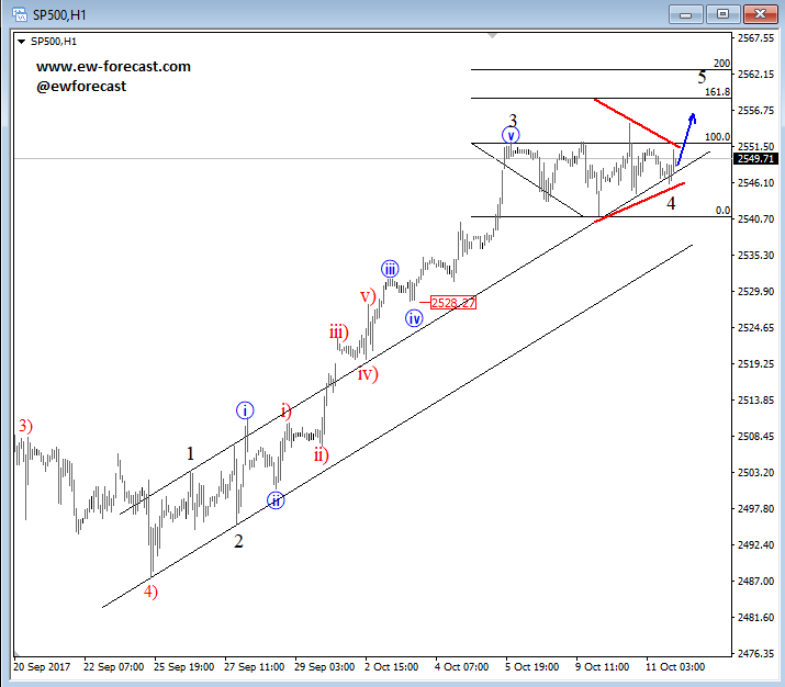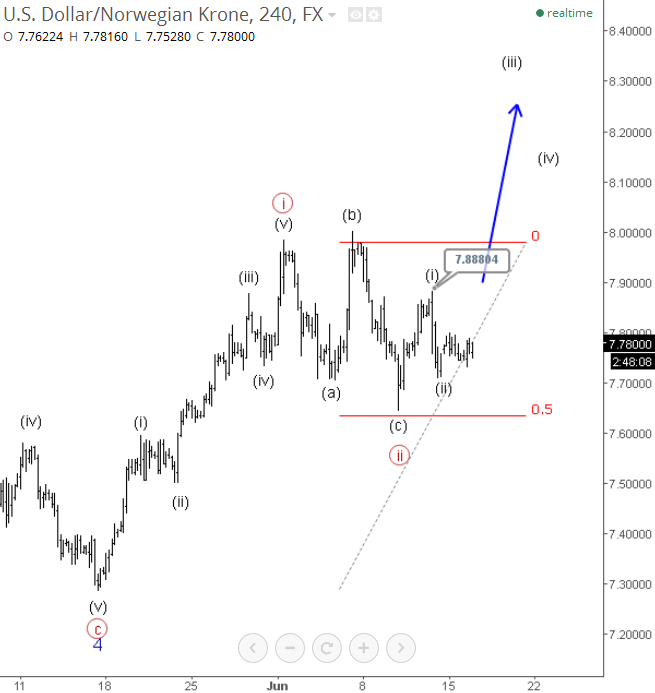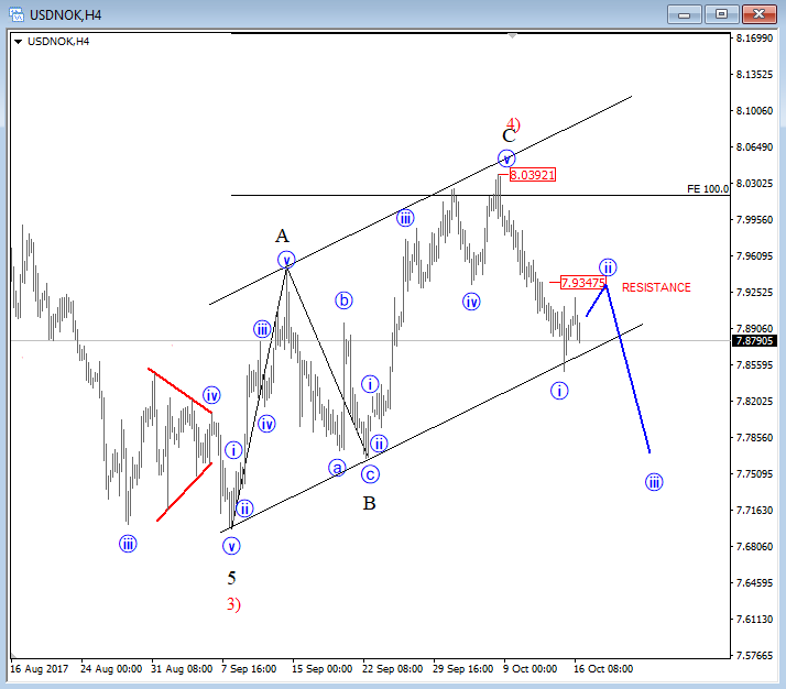 Stocks are waiting FOMC when markets may again break to new highs if we consider recent structure on E-mini S&P500; it's a triangle that is pointing higher into wave 5, towards 2560. A triangle correction is an Elliott wave pattern, that unfolds prior to the final wave, meaning once fully unfolded a new and final push into the direction of the trend may follow. In our case this is to the upside. A triangle pattern consist out of five waves and usually each of them have three minor legs. S&P500, 1H ![]() Oct 16 2017; USDNOK Can Resume Downtrend