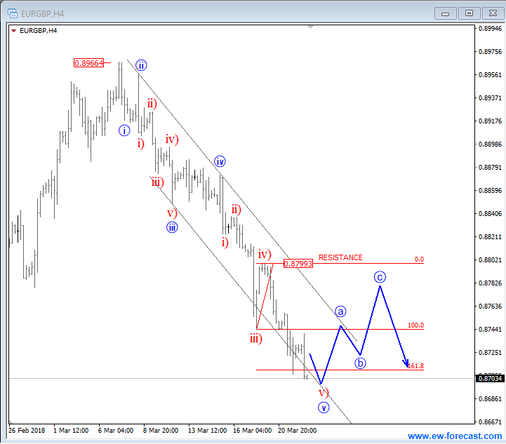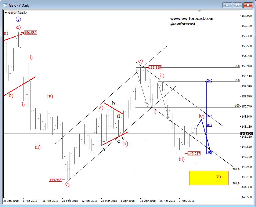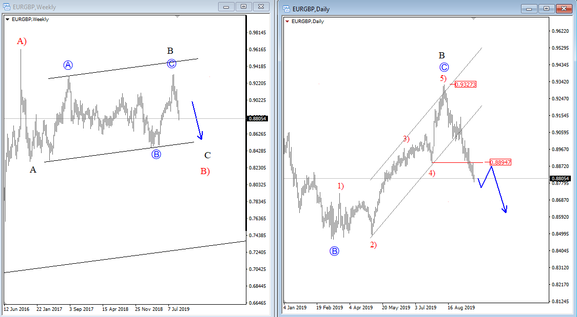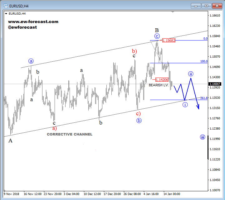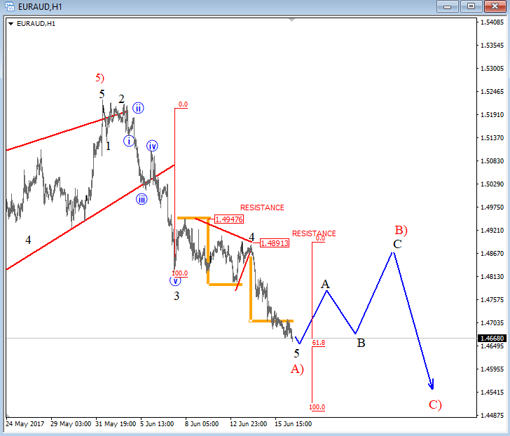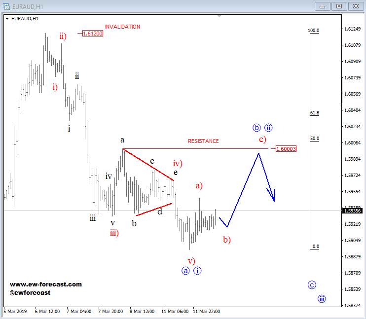 GH ![]() Previous Next March 12 2019; EURAUD Can Be Forming A Bearish Setup EURAUD turned nicely bearish with five waves away from projected resistance, so seems like it's bearish confirmed now. But, before a continuation lower we may see a three-wave corrective recovery, where 1.6000 area can be retested and may act as a strong resistance. Anyhow, we remain bearish as long as it's trading beneath 1.6120 invalidation area.