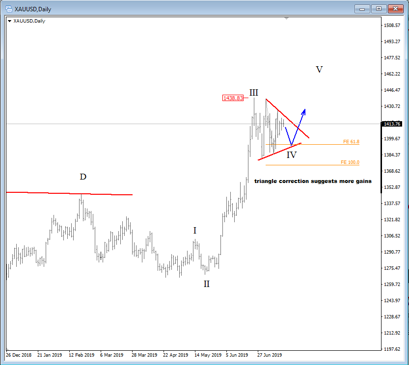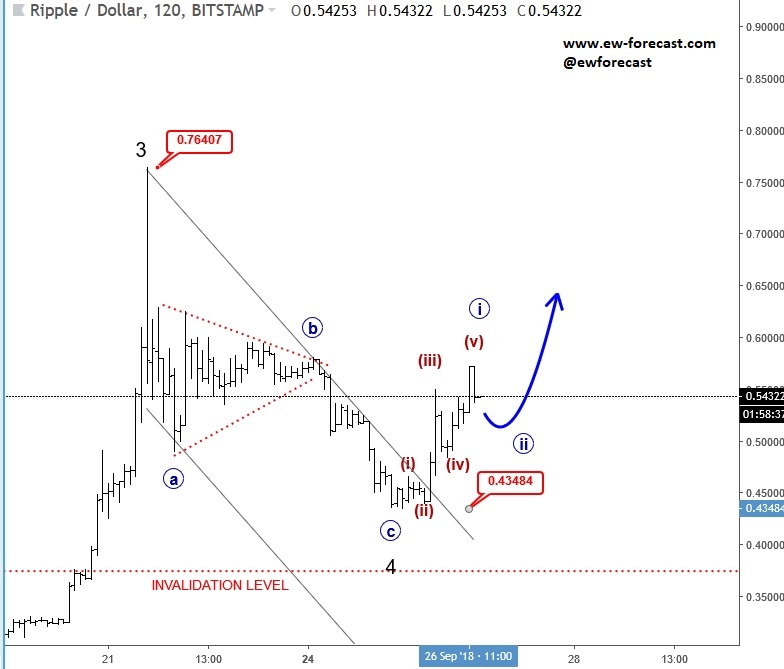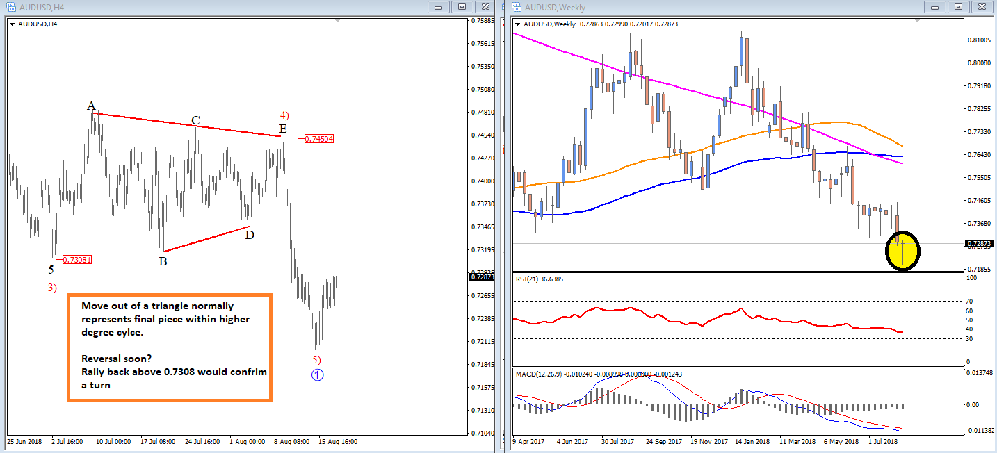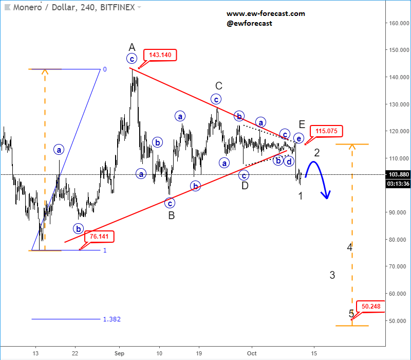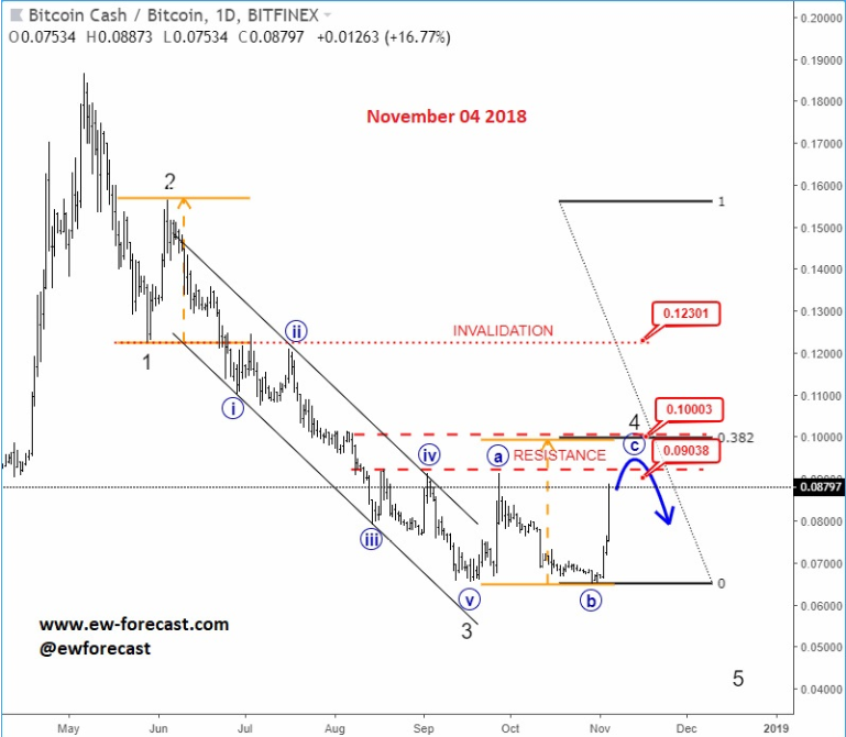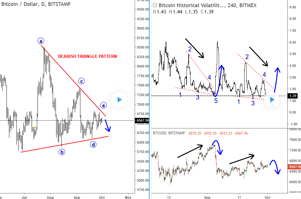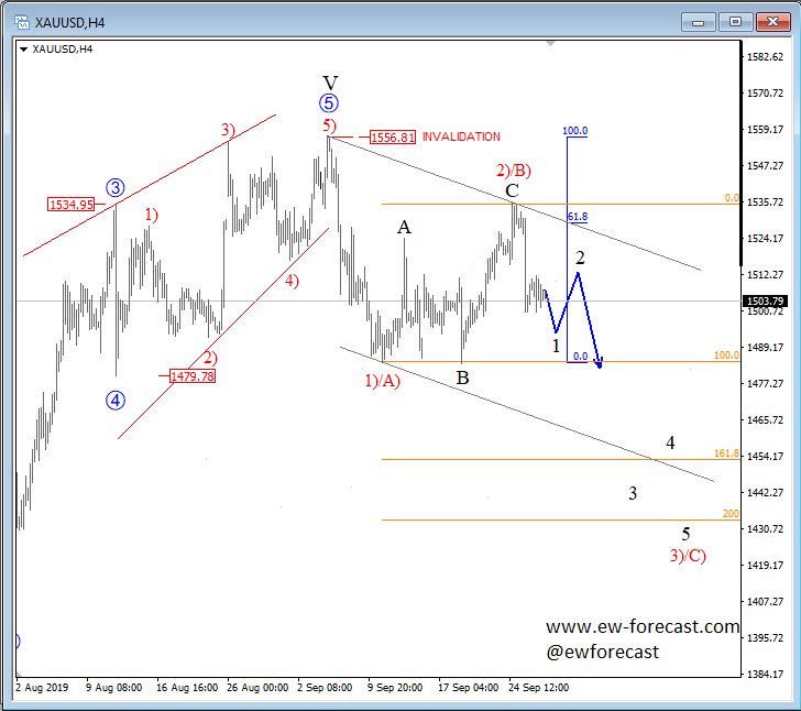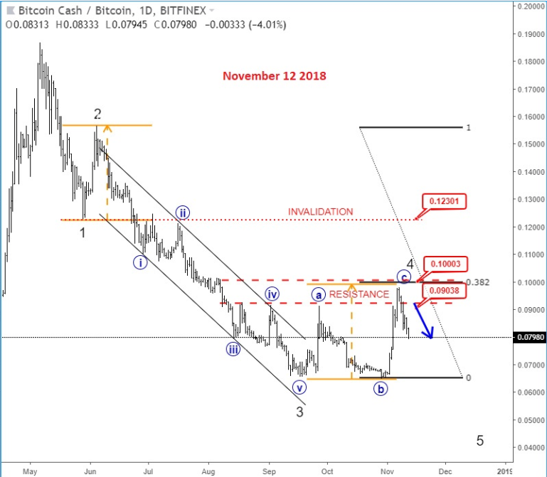 GBPJPY, 4h ![]() Previous Next Sep 27 2018; Has Ripple Found A Base? A completed three-wave correction on Ripple can suggest more upside. Ripple, 2h ![]() Previous Next Oct 01 2018; Can Crude Oil Hit 80USD? H&S projected target, and daily+weekly Fib. levels show room for $80 on Crude Oil. Crude oil, Weekly + Daily chart ![]() Previous Next Oct 01 2018; BTCUSD Volatility Index We are tracking BTC Volatility Index, where we can see diagonal in progress, so we may see higher volatility soon, similar as it happened at the beginning of Septembe. S once volatility index turns up, we may see BTCUSD falling sharply once again if we consider that current recovery is on slow pace. ![]() Previous Next Oct 04 2018; Five Down On 10 Year US Notes 10 year US notes can be looking to complete five wave cycle from September highs. 10 Year US Notes, Daily ![]() Previous Next Oct 08 2018; Is USDJPY Ready To Turn Bearish? Bearish weekly candlestick formation on USDJPY and five down on 10 year US note may suggest a reversal in upcoming week. Ideally USDJPY will see lower prices while 10 year US note finds a support. 10 Year US Notes and USDJPY ![]() Previous Next Oct 12 2018; Triangle on Monero Points Lower Monero has recently completed a bigger triangle, a continuation pattern which now already points towards new lows. We expect to see a five-wave decline in the next few days or weeks. Monero, 4h ![]() Previous Next Oct 22 2018; Risk-off May Continue More weakness on stocks may cause another leg down on XXX/JPY pairs. I am closesly wathcing AUDJPY and USDJPY. GH Intra-day correlations chart Previous Next Oct 26 2018; Silver Moving Into Resistance Anyone that is bullish on silver, may want to consider the following chart. I think that bullish price action can be limited as I see price testing a triangle trendline from the outside, while recovery on intraday has personality of a correction. Important resistance levels are at 15.00 followed by 15.50. GH Silver, Weekly + 4h Previous Next Oct 29 2018; Gold Hits Important Resistance A three-wave recovery on Gold can slow down at important 1235/1250 resistance area. GOLD, Daily ![]() Previous Next Nov 05 2018; Dax Can Fall To 11200/11250 DAX can see more weakness, at least short-term towards 11200/50 after recent turn down below the wedge trendline and possible H/S pattern. Previous Next Nov 12 2018; BCHBTC Flashback As expected, we have seen a nice bearish reversal from projected resistance area (0.1000) on Bitcoin Cash (BCHBTC). More weakness in view towards new lows! BCHBTC, Daily (before chart) ![]() BCHBTC, Daily (after chart) ![]() Previous Next Nov 14 2018; FLASHBACK: Vertcoin Trading As Expected Vertcoin against the dollar is trading exactly as expected. We can see that price was still unfolding a complex consolidation on October 23, however one week later new breach and weakness was seen, which continued towards the 0.5804 level. Now the question that remains is can we expect an even further bearish continuation? Vertcoin/USD Flashback charts ![]() Previous Next Nov 15 2018; Bullish Gold and AUDUSD Gold bounced from a double trendline support which can cause more upside and potential lift Aussie to higher prices too. Gold and AUDUSD, 4h and 1h charts ![]() Previous Next Nov 21 2018; Crude Oil Ready TO Bounce? 30min chart of crude oil shows five waves of recovery, that can be an important bullish reversal that may drive prices even higher after a-b-c set-back. That five waves up also occurred from the EW channel support line shown on 4h chart. CRUDE OIL, 4h and 30min charts ![]() Previous Next Dec 12 2018; Triangle Suggests Weaker Oil Prices Crude oil is trading bearish since start of October, however stopping for a temporary triangle in wave 4. Be aware of more weakness, below 49.36 level, once this correction fully develops. Crude oil, 4h ![]() Previous Next Jan 07 2019; NZDUSD Is Recovering NZDUSD is slowly and steadily recovering from the 0.658 area; ideally a new five-wave rally is in progress, which can aim beyond the 0.697 level. NZDUSD, 4h Previous Next Jan 09 2019; EURCAD Watch Out For A Rally Euro crosses are bearish, but short-term picture suggests that some pairs may see a corrective rally. EURCAD may see an A-B-C move higher if trendline is broken. In such case new ideal resistances for a downtrend to continue is around 1.5300. EURCAD, 1h ![]() Previous Next Jan 16 2019; Bears Taking Over EURUSD EURUSD is nicely trading lower, now breaking below the 1.142 bearish level which indicates a minimum three-wave drop in play. That said, be aware of temporary corrections. EURUSD, 4h ![]() Previous Next Jan 18 2019; FLASHBACK: German DAX Trading As Expected German DAX traded perfectly out of an ending diagonal, which was located in wave 5) in December. We can now see a nice five-wave rally in motion, which can be part of a bigger, bullish cycle and can touch area near the 11300. German DAX, 4h Flashback charts ![]() Previous Next Feb 04 2019; AUDUSD vs USDCNH Is USDCNH completing a corrective setback? Well, if US dollar will rise above 6.85 against CNH, then be aware of limited upside on GOLD and AUDUSD this month. ![]() Previous Next Feb 08 2019; USDMXN Suggests A New Leg Down Feb 13 2019-update USDMXN is higher so triangle that we were tracking was placed in wave b rather than four. But its still a corrective bounce, so resistance may not be far away for this a-b-c move. Reversal can be coming for a fifth wave down; ideally from around 19.42. ![]() Feb 08 2019 USDMXN has some interesting development; showing triangle in fourth wave so be aware of a new push lower. USDMXN, 4h ![]() Previous Next Feb 18 2019; Lumen Can Be Finishing A Big Correction Within Uptrend Lumen (XLMUSD) may have a completed big three-wave (A)-(B)-(C) corrective decline in 2018, which is clearly visible in the logarithmic scale chart, especially since we have noticed a strong resistance from 2017 that can act as a strong support in 2019! That said, be aware of a bullish reversal,