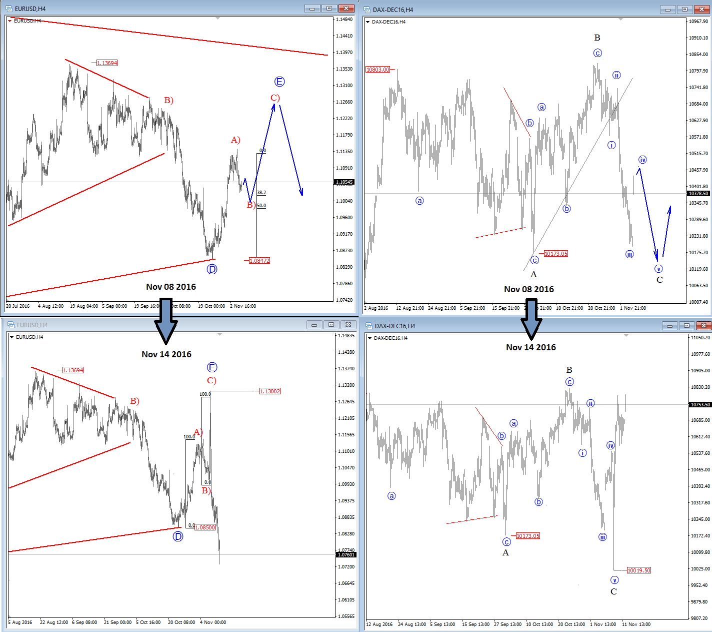 Previous Next Nov 14 2016; Pre and Post US Election Charts Below we can see the EURUSD and DAX before the results of the election and post election. (Click on the chart for a higher resolution) ![]() Previous Next Nov 15 2016; Bulls Taking Over The S&P Now when stocks are in bullish mode, that trendline on S&P can be interesting, near the 2130 region.