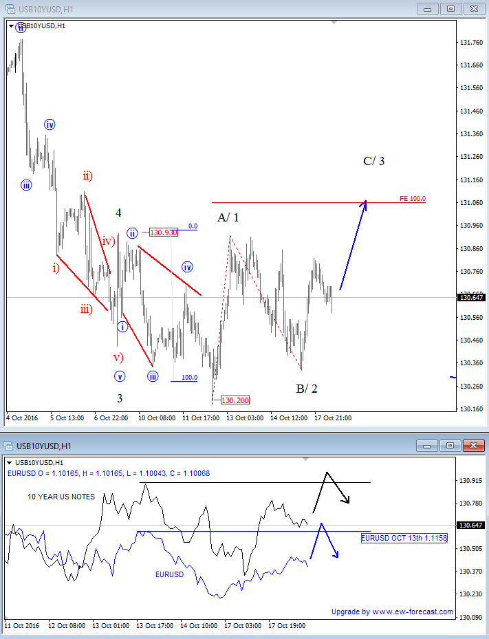 ![]() Previous Next Oct 18 2016; 10 year US notes vs EURUSD More upside on 10 year US notes into wave C suggests that EURUSD can also retrace back to 1.1050/1.1060 resistance based on positive correlation.