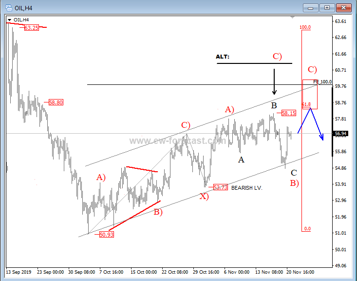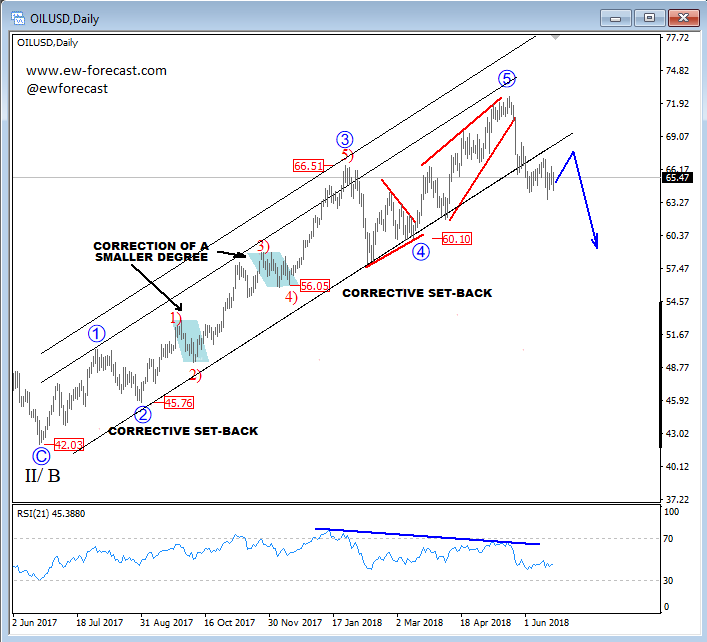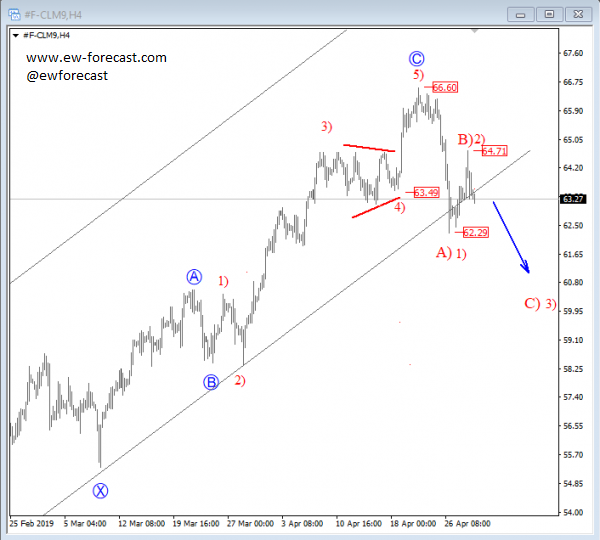 Are you tracking BTC Long/Short ratio? I really think you should since it may tell you a lot about the next cycle for the bitocin price. Notice that BTC Longs / BTC Shorts ratio is at the lower side of a range so BTC Longs may step in soon and likely support bitcoin price even more, which is bullish already now! I posted some interesting video on this topic and highlighted potential rise of btc back to $6500. If you want to see the video make sure to check our promotion offer. ![]() Previous Next May 01 2019; Crude Oil In A Three Wave Drop Crude oil looks to have found a top at the 66.60 level for a bigger corrective retracement. As such latest sharp drop can be part of a three-wave reversal, that can take price below the 62.30 level, and towards the 60.0 region.