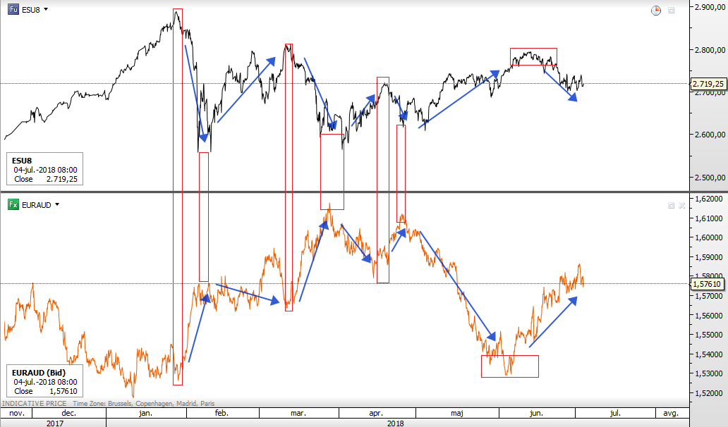 Previous Next July 04 2018; EURAUD vs E-mini S&P500 Are you trading cross pair EURAUD, but not paying attention to stocks? Well, based on price action since January we think there is important relationship. EURAUD vs sp 2h ![]()