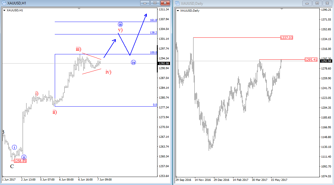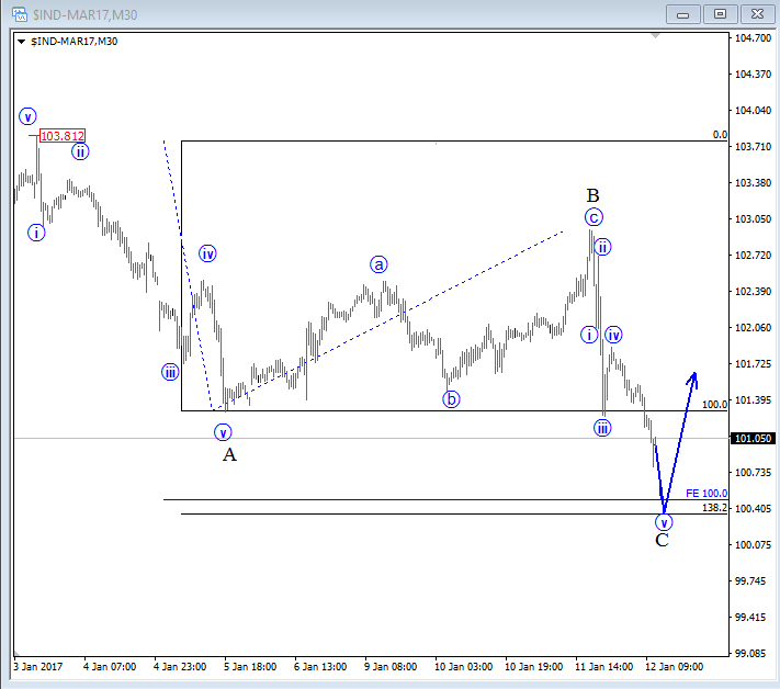 Trump sent buck down yesterday, but don't fall in love with USD weakness too soon. Higher degree trend is still up while intraday charts has three waves down, now near support. ![]() Previous Next Jan 31 2017; Time And Cycle Analysis For S&P500 Longer term, time and cycle analysis on S&P500 highlights 2500 price but month of February 2018 may also be very important. ![]() Previous Next Feb 07 2017; EURUSD and USDJPY Video Previous Next Feb 21 2017; Nikkei vs USDJPY Nikkei has a continuation pattern which can send price to a new high soon, so USDJPY may see more upside as well based on positive correlation. ![]() Previous Next Mar 06 2017; Intraday Turn On S&P 500 Futures Impulsive fall from the high suggests that minimum three wave decline of a higher degree is here. ![]() Previous Next Apr 12 2017; GBPUSD Cable is looking interesting from a bullish perspective as bounce from 1.2364 (April 07 low) appears to be in impulsive fashion, so pullbacks may be opportunity to join the uptrend. Watch out for three wave set-backs. ![]() Previous Next Apr 25 2017; Intraday Strength On USDCAD USDCAD in showing a five wave move from April 12 low, so reversal may follow in the near-future. First resistance is near 1.3580, and next one is seen around 1.3680. ![]() Previous Next Apr 28 2017; Sugar Searching Support Sugar appears to be trading near interesting, potential support levels based on Elliott Wave structure as well as maybe "too much" bearish sentiment. Also, higher degree cycle shows a potential contra-trend move in three legs. Rise above wave four would be first step towards a trend-change. ![]() Previous Next May 15 2017; Intraday Crude oil Crude oil is moving into some interesting Fib. levels near 49. ![]() Previous Next May 17 2017; NZDJPY and its correlation with E-mini S&P500 This is an intraday view of NZDJPY published on May 12 Previous Next May 22 2017; DAX Dax may see another leg down, into wave C) back to 12380/12400 area while below 12840. ![]() Previous Next June 02 2017; USDCAD Intra-day Correction Three wave rally on USDCAD back to former wave four looks like a nice corrective bounce as part of a downtrend. Is new leg down coming?! USDCAD, 1H ![]() Previous Next June 07 2017; Intraday Bullish Gold Gold appears to be in nice strong uptrend that may break to a new high of the year. A decisive breakout may open room even for 1337, Nov 09 2016 "Trump Level". ![]()