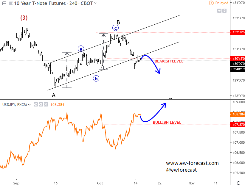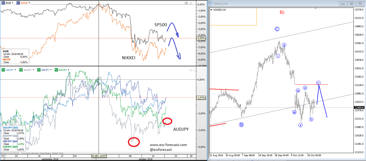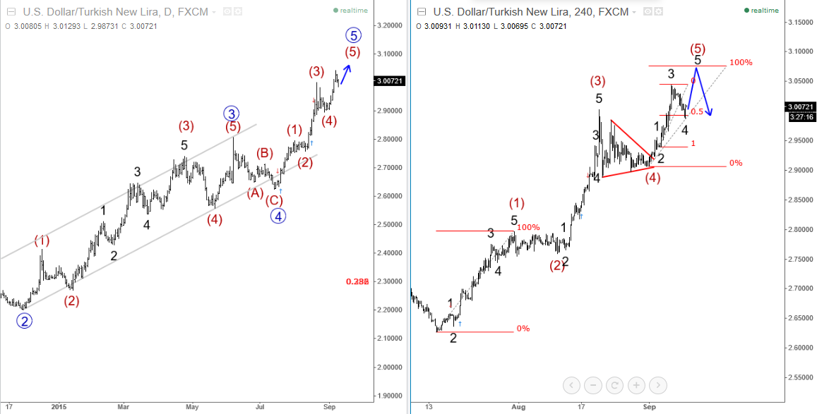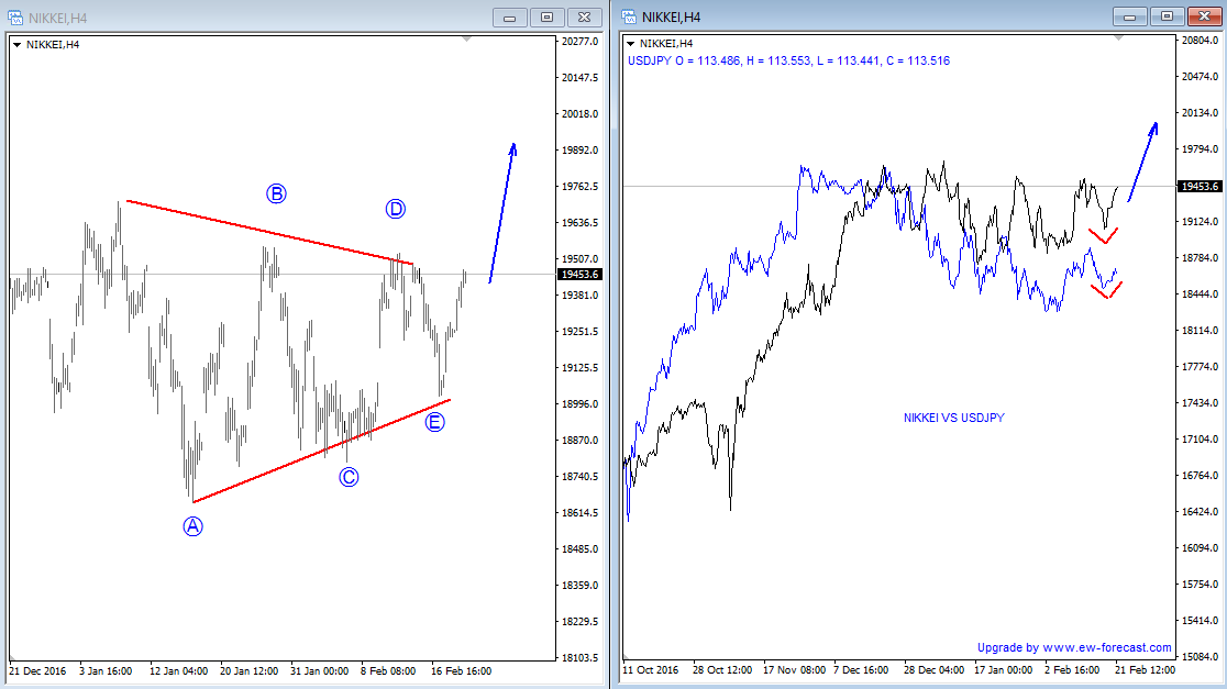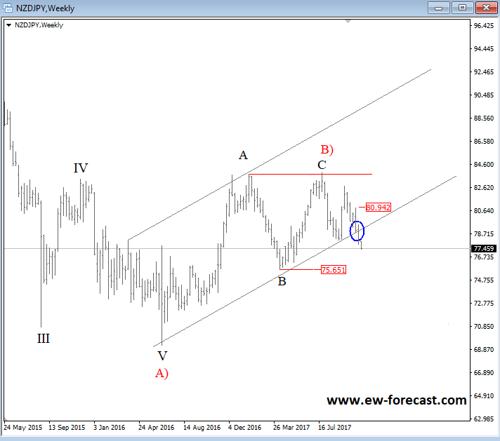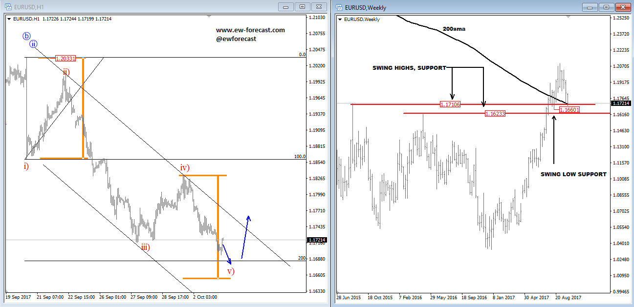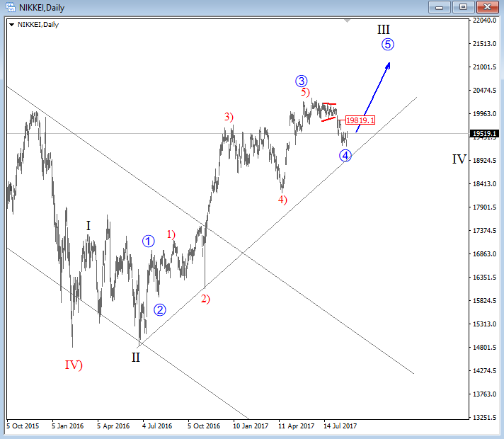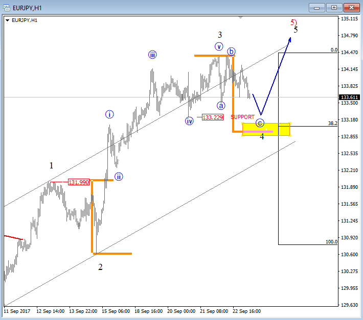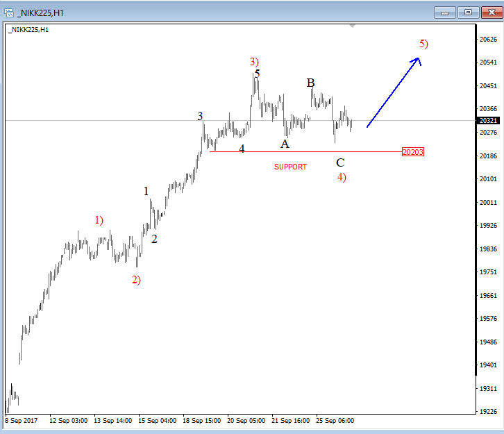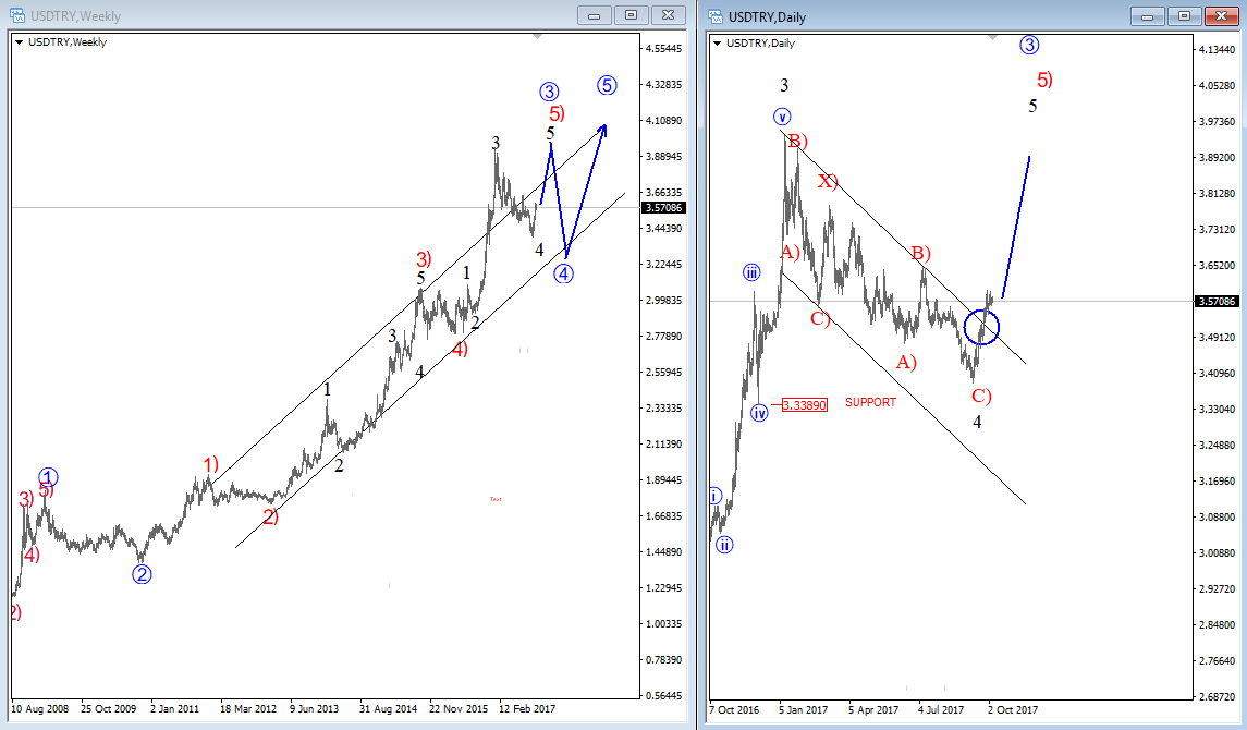 Previous Next Sep 25 2017; Corrective Set-back On EURJPY We see stocks making a correction within uptrend, so we suspect that sooner or later price will be higher. That said, XXX/JPY pairs may stay in uptrend as well. EURJPY can be interesting; support at 133.00. ![]() Previous Next Sep 26 2017; Nikkei225 In Wave 4 Correction Nikkei was lower during Asia, but price settles down after 3-waves of retracement. Now looking bullish for 5 up. More JPY weakness? ![]() Previous Next Oct 03 2017; EURUSD Trading Near Support Markets in Germany are closed today due to German Unity Day, so EURUSD may not move much, unless we get some strong USD reactions later today. Technically speaking, we see EURUSD pair trading into some interesting support area here at 1.1700 where pair may bounce if we consider a fifth wave down right into some interesting old swing levels on a weekly basis that may turn into a support. There is also 200SMA that may cause a turn in the second part of this week. EURUSD, 1H and Weekly ![]() Oct 05 2017; Resumption Of An uptrend On USDTRY After nice 9 months of a corrective set-back, USDTRY is again showing signs of a recovery after recently broken channel line on a daily chart. USDTRY, Weekly and Daily ![]() Previous Next