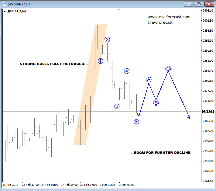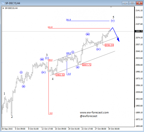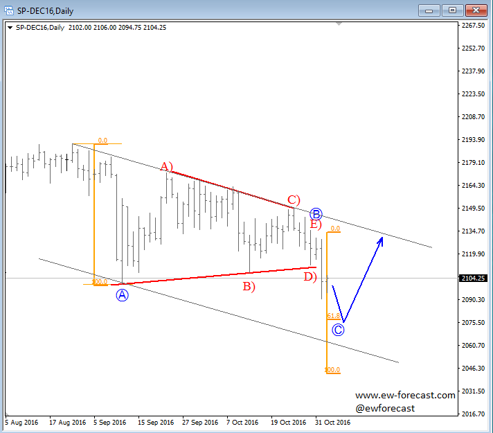 Nov 02 2016; Corrective Pullback On S&P500 We see a three wave decline on E-mini S&P500, with a triangle in the middle, so current leg down can be temporary with first support seen at 2080 followed by the next one at 2060 area. This market may not be so bearish as it seems...