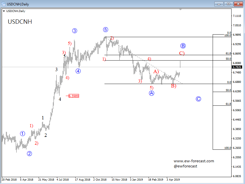 Platinum, Weekly (Before and After) ![]() Previous Next May 06 2019; Decline On USDCNH Does Not Look Finished First reactions to unexpected events are emotional and do not necessarily represent the "real" market flow. Everyone are calling $USDCNH to 7.00 after latest Trump twitts regarding the trade deal with China, but technicals say different.
