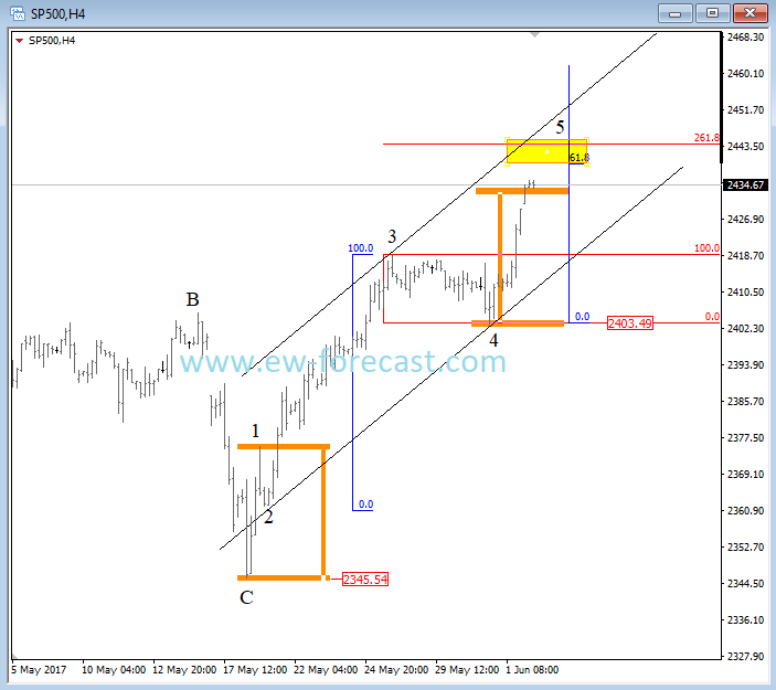 June 02 2017 S&P500 is trading at all time highs with some sharp price move up from 2403 that we see it as fifth wave rally; final part of a five wave recovery from 2345, called an impulse wave*. There are some Fibonacci levels around 2440 that may play out an important roll for the next few sessions, as we think that upside can be limited and that new corrective set-back can be coming at the start of June. However, extended fifth waves are very common on stock markets, so do not chase it and call a top until you see a five wave drop from the high.